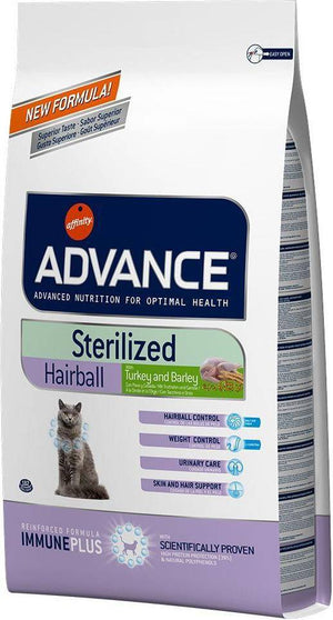 Advance Cat Sterilized Hairball is een compleet kattenvoer op basis van kalkoen en rijst speciaal voor gesteriliseerde of gecastreerde katten met haarbalproblemen.