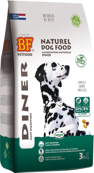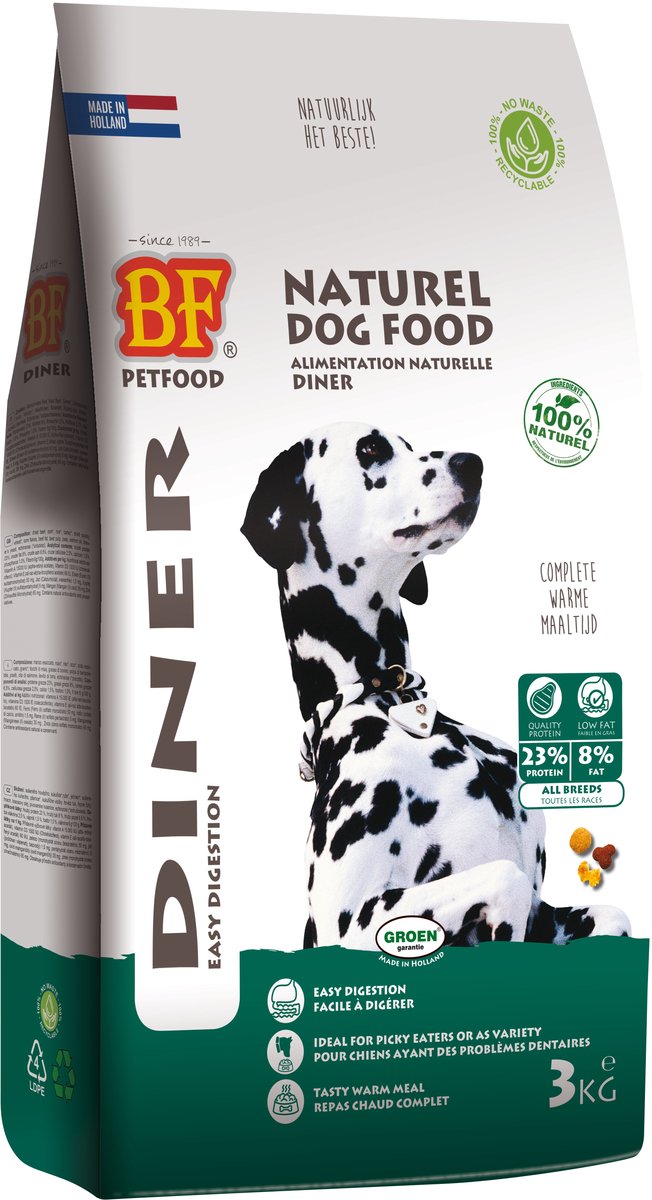 De BF Petfood Diner 3 kg is een volledige voeding voor honden uit hoogwaardige natuurlijke grondstoffen. Deze volledige, licht verteerbare geëxtrudeerde hondenvoeding voor volwassen honden is rijk aan rund, kip en rijst. Met gezonde groenten, zalmolie en kruiden. De voeding heeft een hoge acceptatie en verteerbaarheid. Met gezonde zalmolie welke rijk is aan Omega 3 & 6 vetzuren. Diner kan de voorkeur hebben als een hond niet van brokken houdt, niet goed kan kauwen, slecht eet, dunne ontlasting heeft of vezelrijk voer moet hebben. Dit is een optimale voeding die bijdraagt aan een betere vertering, ontlasting en een goede conditie van jouw hond. Zonder chemische toevoegingen. Voor alle hondenrassen. Voeg simpelweg warm water aan het voer toe om het te bereiden. Het voer begint te wellen waarna jouw hond een gezonde en lekkere warme maaltijd heeft.
