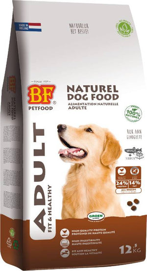 BF Petfood Adult Krokant 12,5 kg is een volledige licht verteerbare, natuurlijke en zeer smaakvolle hondenvoeding voor alle rassen. BF Petfood (voorheen Biofood) Adult Krokant bevat gevogelte, rund, wild zwijn en zalm. Met zalmolie, schapenvet, rijst en kruiden. Tarwevrij. Hoge acceptatie en verteerbaarheid. Zalmolie met essentiële omega 3 vetzuren ondersteund huid, vacht, vitaliteit en weerstand. De toegevoegde echinacea kruiden ondersteunen het afweersysteem. De natuurlijke bronnen van eiwitten en vetten zijn van hoge kwaliteit. Deze zorgen voor een betere vertering, ontlasting en een goede conditie van jouw hond. Voor alle hondenrassen