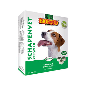 De BF Petfood Schapenvet Bonbons Mini Zeewier 80st is een natuurlijk middel ter ondersteuning van afweer, huid, vacht, (spijs)vertering en weerstand. Zeewier bevat mineralen, sporenelementen, aminozuren en vitaminen. Het is tevens een uitzonderlijk gezonde en smaakvolle toevoeging op de dagelijkse voeding. Schapenvet bevat ongeveer 58% verzadigde vetzuren en ongeveer 32% enkelvoudig onverzadigde vetzuren. Vet is een smaakmaker en belangrijk bij de transport van vitamine A, D, E en K in het lichaam. Daarnaast gaat het vetmetabolisme van de hond zeer efficiënt om met vet en zet vet om in energie. Aanvullend voedingsmiddel voor alle hondenrassen en alle leeftijden.