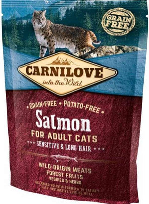 Carnilove Salmon/ Sensitive Long Hair 400 gr is graanvrij, kwalitatief hoogwaardig volledig kattenvoer voor katten met zalm, speciaal voor dieren met lang haar en gevoelige spijsvertering. Deze brokken zijn geheel vrij van aardappel en graan, omdat deze ook niet in het natuurlijke dieet van de wilde kat en diens voorouders voorkomt. In plaats daarvan is er gebruik gemaakt van ingrediënten die beter aansluiten bij de voedingsbehoefte van de kat, namelijk een hoog aandeel dierlijke ingrediënten gecombineerd met verse groenten, fruit, kruiden en mineralen. Deze bevatten belangrijke vitaminen en anti-oxidanten, die door de structuur van de gebruikte eiwitten optimaal opgenomen worden door het lichaam. Ook is dit voer verrijkt om bijzonder geschikt te zijn voor katten met lang haar of een gevoelige spijsvertering. Het voer is nauwkeurig uitgebalanceerd, makkelijker verteerbaar, holistisch en ook gewoon heel erg lekker.