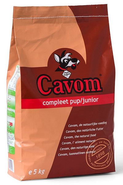 Cavom Compleet Pup/Junior 5 kg is volledige voeding voor puppy’s en opgroeiende honden. Deze smakelijke hondenbrokken zijn speciaal ontwikkeld voor honden pups vanaf 4 weken tot 9 maanden oud. Jonge honden groeien heel snel. Cavom Compleet Pup/Junior bevat alle nodige voedingstoffen in de juiste verhouding om deze snelle groei op te vangen. De granen, o.a. mais, tarwe en rijst, zijn praktisch geheel ontsloten. De diverse dierlijke eiwitten met rund en lam, plantaardige eiwitten, rundvet en oliën zorgen voor een hoge calorische waarde. Eerst het voer weken met melk, later met karnemelk of water. Geleidelijk minder vocht toevoegen.