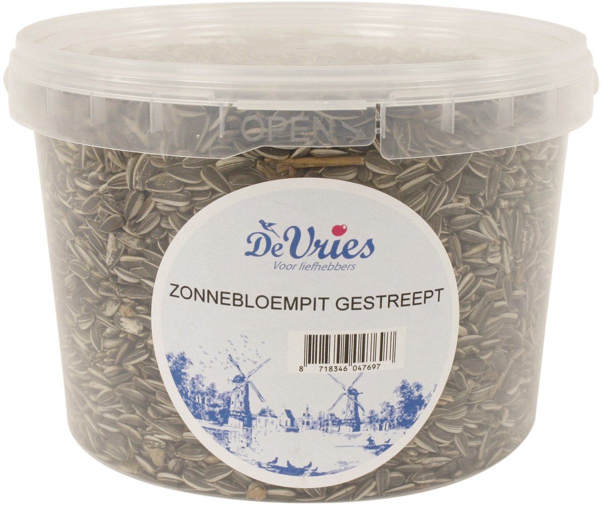 De Vries Zonnebloempit Gestreept 3 liter is aanvullend diervoeder voor vogels, geheel natuurlijke zonnebloempitten voor jouw vogel, de ideale aanvulling of snack voor grotere parkieten en (dwerg)papegaaien. Deze lekkere snack is zeer geliefd bij veel vogels en is ideaal om als beloning bij training of als aanvulling op het voer te geven. In een handige hersluitbare emmer!