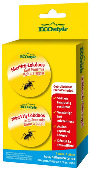 De ECOstyle Mierenlokdoos zorgt voor effectieve bestrijding van mieren in huis, op terras en balkon. De werkzame stof wordt door de werksters van het mierenvolk meegenomen in het nest. Het mierenprobleem wordt daardoor bij de bron aangepakt. Afhankelijk van de grootte van het nest en de activiteit van de mieren kan het eventjes duren voordat de totale mierenoverlast is opgelost.