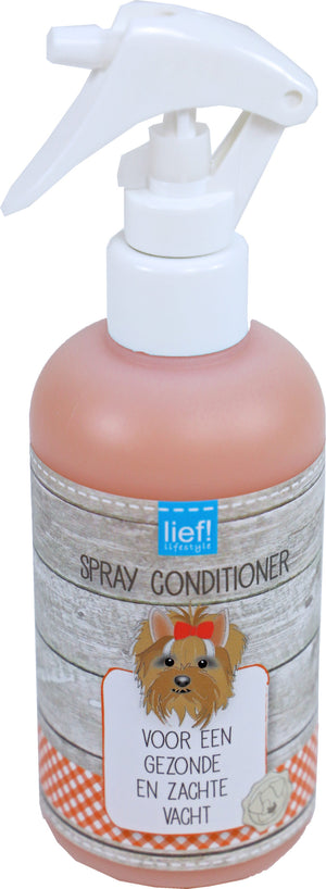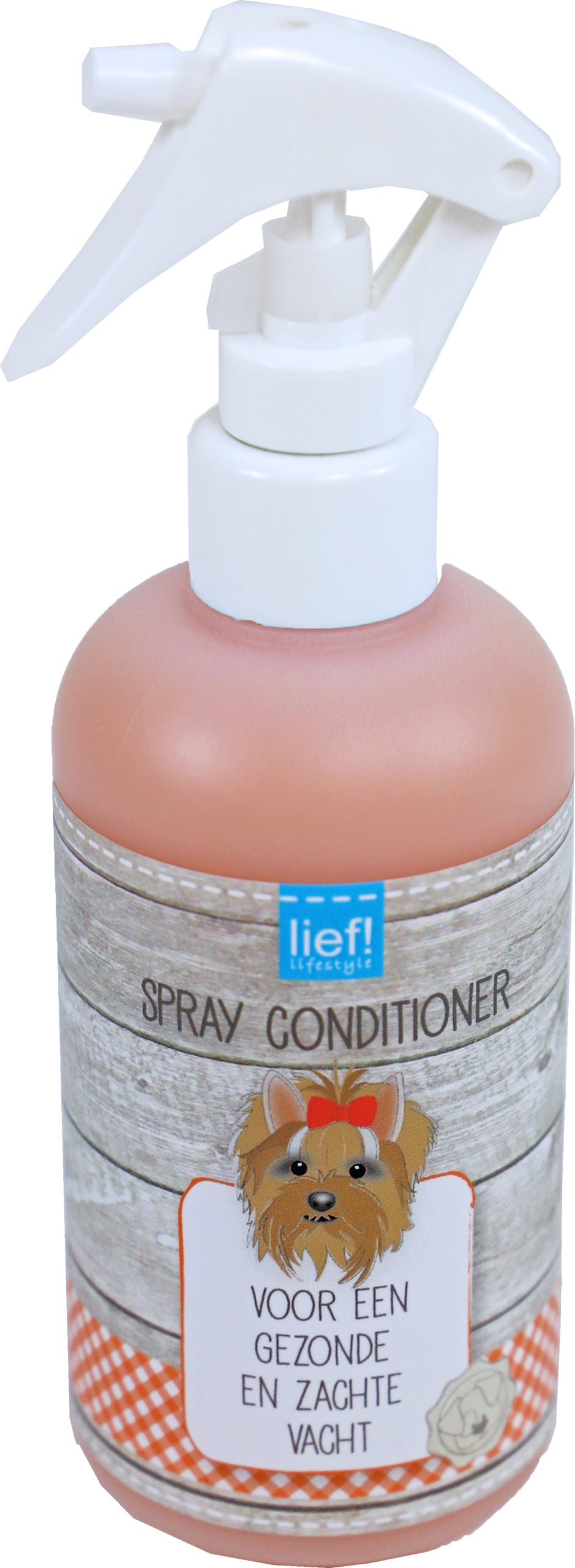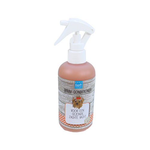 De Lief! Spray Conditioner van 250 ml is een lekkere conditioner voor honden met een lange, gekrulde en klittende vacht die hydrateert en herstelt. Deze heerlijk geurende spray conditioner kun je op elk gewenst moment op de vacht aanbrengen om deze gemakkelijk door te kunnen kammen. De vocht inbrengende conditioner zorgt voor een gezonde, zachte en glanzende vacht die makkelijk doorkambaar is. Door de PH-neutrale formule zorgt de conditoner dat er goed vocht wordt vastgehouden en de vacht elastisch blijft.