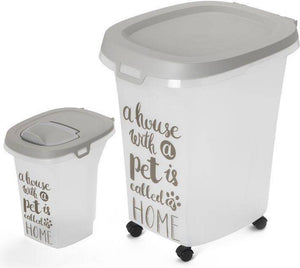 Moderna Voercontainer Trendy Shorty Pet Wisdom 38 ltr 46 x 37 x 47,5 cm is een kusntstof opbergcontainer voor dierenvoeding, met verwijderbare bovenkant en deksel en leuk design. Deze voercontainer is uitgevoerd in neutraal, modern wit met een bovenkant van taupe, die luchtdicht afsluit om het voer van jouw viervoeter zo lang mogelijk vers te houden. Het voer is bereikbaar door het klepjes bovenop, maar ook kun je de gehele bovenkant verwijderen om de containter gemakkelijk te kunnen vullen. Om het af te maken is de voercontainer bedrukt met de tekst 'A house with a pet is called a home' in zwarte design-letters. Met wieltjes voor gemakkelijk verplaatsen!