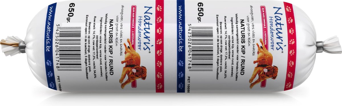 Naturis Versvlees Houdbaar is van dezelfde grondstoffen gemaakt als ons diepgevroren vers vlees. Dus van vlees dat geschikt is voor menselijke consumptie en eveneens afkomstig van EEG goedgekeurde slachthuizen. Aan alle soorten is ook zeewier toegevoegd daar dit een natuurlijke bron van verschillende vitaminen is voor uw hond.