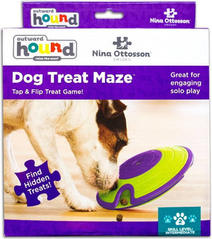 Train je hond zijn geest en lichaam met het Nina Ottosson Dog Treat Maze! Dit treat spel werkt om honden lerenderwijs gemotiveerd te houden en tegelijkertijd te vermaken. Het spel is leuk en makkelijk te gebruiken!