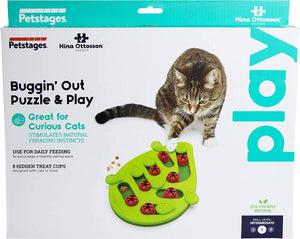 De Nina Ottoson Puzzle & Play Buggin Out Groen is een uitdagend intelligentiespel voor de kat, waarbij de kat de schuifjes moet verplaatsen om bij de beloning eronder te komen. De kat moet moet de poten de schuifjes opzij schuiven en draaien om bij de gaatjes eronder te komen en de beloningen daarin te pakken te krijgen. Hoe meer schuifjes je afsluit, hoe moeilijker het spel is: dit kun je dus zelf bepalen. Het spel zorgt dat de kat actief moet nadenken over hoe zijn doel te bereiken en hij tevens lichamelijk bezig is. Je kunt het ook gebruiken als vervanging voor de voerbak: de kat is zo veel langer actief bezig met zijn voer en zal veel minder schrokken. Al met al is dit spel goed voor urenlang speelplezier en de perfecte manier om verveling tegen te gaan!