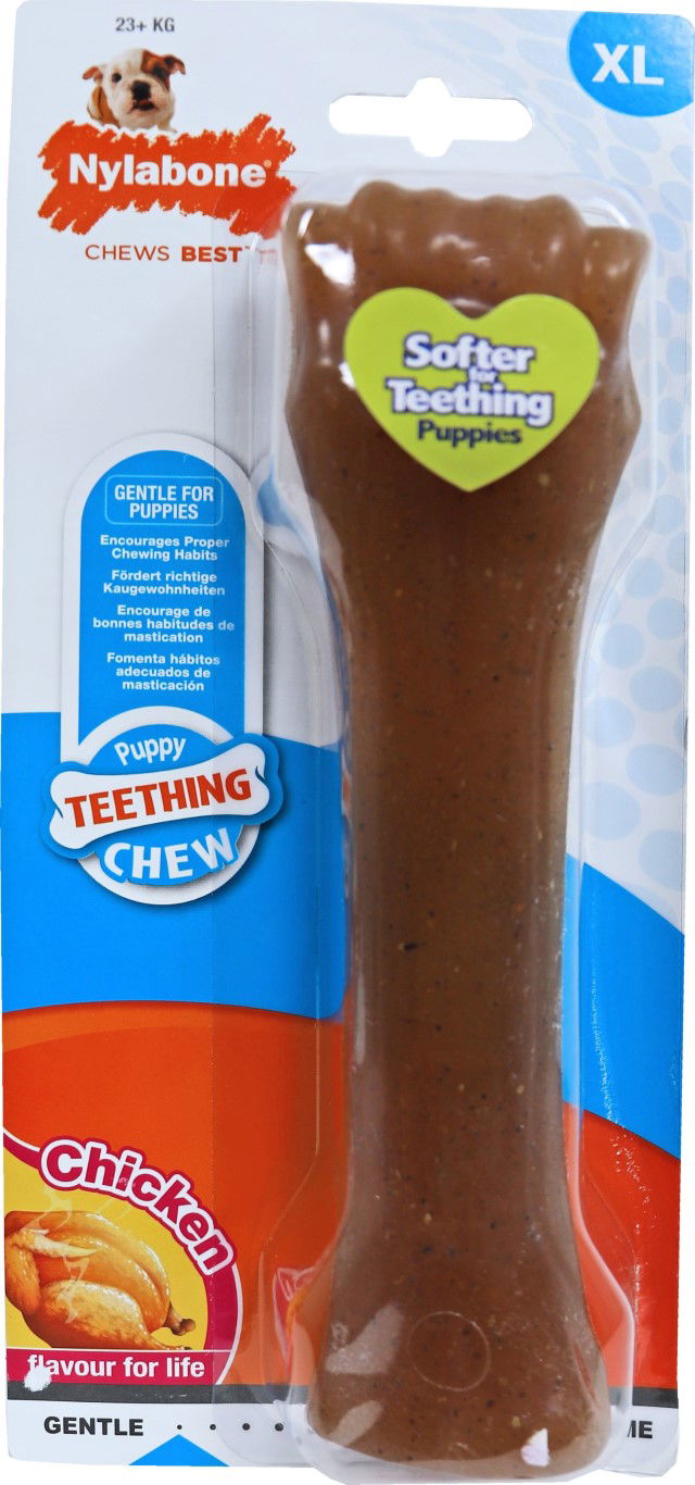 De Nylabone Puppy Chew Chicken >23kg is speciaal ontworpen voor puppy's waarbij de tandjes net door beginnen te komen of met melktandjes. Het aantrekkelijke bot met kip smaak bevordert het kauwen en helpt tandjes gemakkelijker doorkomen. Het zachte maar taaie materiaal is polyurethaan. Hierdoor is dit speeltje geschikt voor pups waarbij de tanden net doorkomen én met een melkgebit. Deze kluif is bijna onverwoestbaar en zal bij intensief kauwen langzaam slijten, er komen alleen maar schraapsels van de kluif af. Dit kan geen kwaad omdat dit niet door het lichaam wordt opgenomen, de schraapsels verdwijnen via de natuurlijke weg (ontlasting) uit het lichaam. Het ideale speeltje voor pups tot ze gaan wisselen.