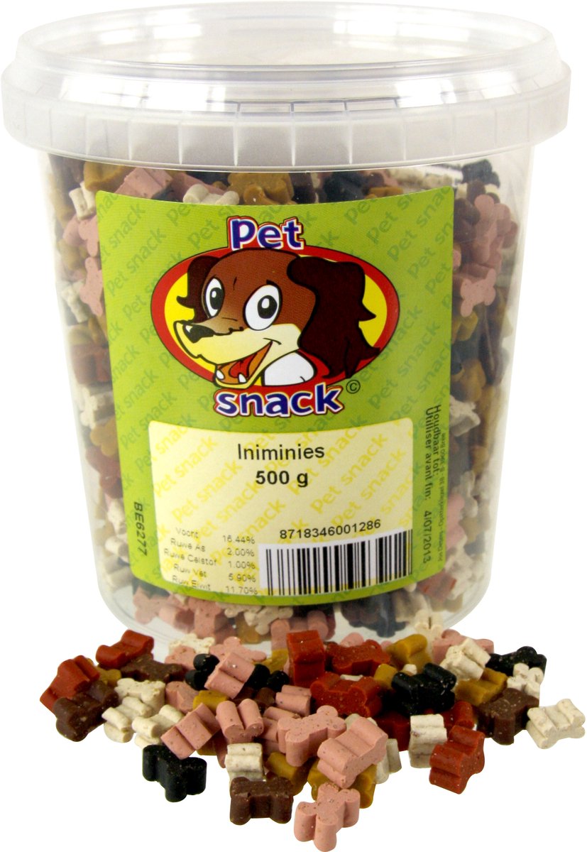 De Petsnack Iniminies 500 gr zijn lekkere zachte hondenkoekjes op basis van graan en vlees in verschillende kleuren.