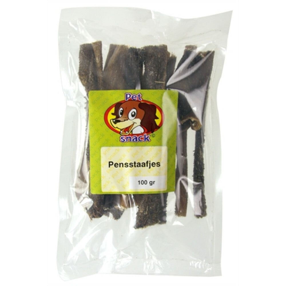 Petsnack Pensstaaf 15 cm 100 gr hondensnack is een kauwsnack voor honden van gedroogde runderpens zonder conserveringsmiddelen. De stukjes pens zijn gedroogd en gemaakt zonder conserveringsmiddelen, 100% natuurlijk dus! Pens kun je geven als lekkere snack of als beloning. Het geven van pens kan het eten van poep op straat voorkomen bij pups.