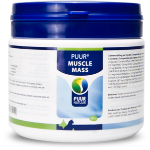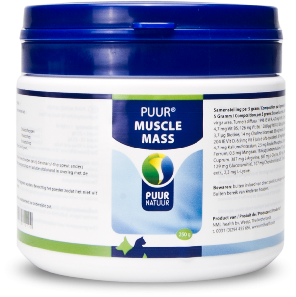 Voor de spieren, meer spierkracht, spiermassa en uithoudingsvermogen. Voor de jonge slungelige hond ter ondersteuning van spieren en pezen en voor de oudere hond bij een slappe achterhand. puur muscle mass is aanvullende diervoeding voor de hond(kat).