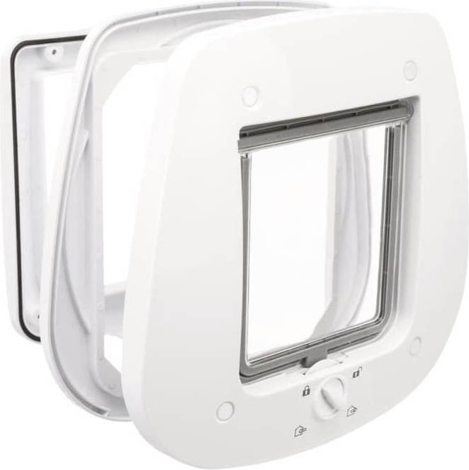 Het Trixie 4-weg Kattenluik Speciaal Voor Glas Wit 27X26 cm is een kunststof huisdierluik voor honden en katten speciaal voor deuren van enkel glas. Ideaal voor mensen die een glazen deur hebben, maar toch willen dat hun dier naar buiten en naar binnen kan. Het luik kan ingesteld worden op alleen naar binnen, alleen naar buiten, allebei en geen van beiden en heeft een makkelijke draaisluiting om te bepalen in welke richting het luik open kan. Het luik is uitgerust met een transparante klep die jouw en jouw dier goed zicht biedt op alles buiten en binnen. Het luik heeft rondom een TPR-afdichtring en is geluidsarm. Met drie jaar garantie!