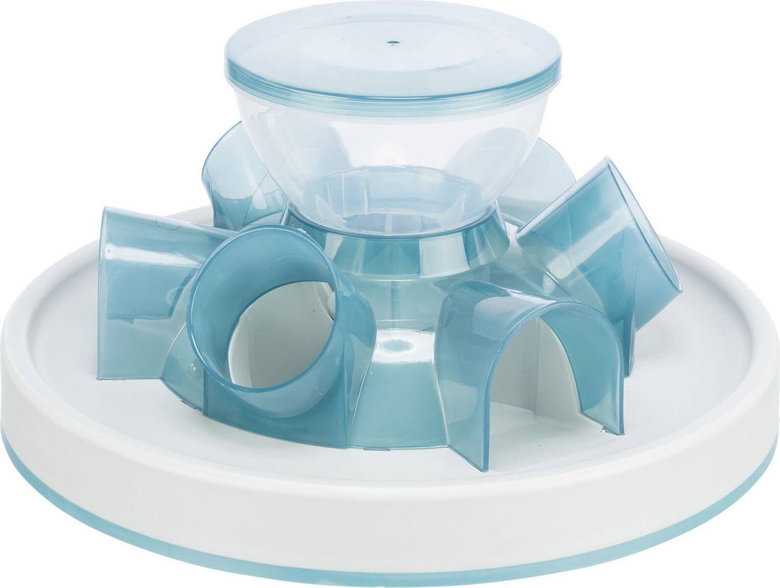 De Trixie Cat Activity Tunnel Feeder Denkspel 28X14 cm kattenspeelgoed is een intelligentiespel voor katten wat ook als slowfeeder werkt door eten in tunnels te vallen. Deze Cat Activity Tunnel Feeder is een handig voederspel om de intelligentie van jouw kat te trainen. Het voer valt vanuit het reservoir in zes verschillende buisjes. De hoeveelheid voer die vrijkomt is doseerbaar, waardoor het goed in te zetten is als slowfeeder. Door de rubberen ring in de bodem is het geheel slipvast. Daarnaast is het geheel geschikt voor de vaatwasser. Dit spel is geschikt voor katten vanaf 3 maanden oud.