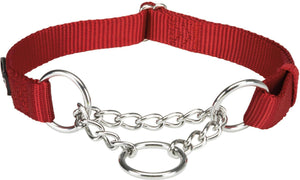 De Trixie Halsband Hond Premium Halfslip Halsband Rood 30-40x1,5 cm is een anti-trek halsband voor de hond met een ketting en verstelbare band. De halsband bestaat deels uit een slipketting en gaat zo trekken aan de riem tegen. De halsband is naast deze anti-trekvoorziening uitgerust met een traploos verstelbare singelband voor een goede pasvorm. De halsband is uitgevoerd in fris, helder gekleurd nylon.