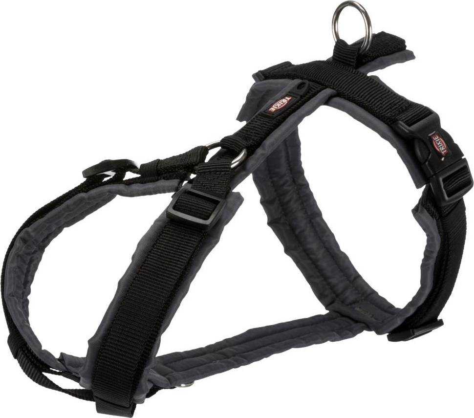 Het Trixie Hondentuig Premium Trekking Zwart / Grijs 70 -85 x 2,5 cm is een comfortabel harnas voor de hond, met zachte voering en extra aanleiding op de buik. Een zeer comfortabel tuig dat speciaal gemaakt is voor baasjes die graag lange afstanden met de hond afleggen, en natuurlijk voor iedereen die gewoon graag wat meer comfort heeft! Dit tuig is gemaakt van stevig singelband met een zachte voering rondom, zodat schuur- en drukplekken ten alle tijden voorkomen worden. Het tuig is bovendien traploos verstelbaar bij de nek en de buik voor een optimale pasvorm. De extra aanlijn-ring op de buik en extra oogjes om bijvoorbeeld een penning of flasher aan te hangen maken het tuig zeer functioneel voor diverse doeleinden.
