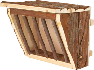 De Trixie Hooiruif Om Op Te Hangen 20 x 15 x 17 cm is een hangende hooiruif van natuurlijk (schors)hout, met deksel, voor konijnen en knaagdieren. Ideaal om in de kooi te hangen; zo voorkom je dat jouw dier het hooi platstampt en verontreinigt. In een ruif blijft het hooi langer fris, waardoor jouw dier het beter zal eten zeer belangrijk voor de afslijting van het gebit en een goede darmwerking! Deze hooiruif biedt door de schuine kant gemakkelijke toegang tot het hooi voor jouw dier, en kan gemakkelijk van bovenaf gevuld worden. De deksel voorkomt dat jouw dier in de ruif kan springen en verwondingen op kan lopen. Deze leuke ruif is gemaakt van natuurhout met schors, en heet daardoor niet alleen een natuurlijk uiterlijk, maar kan ook veilig aangeknaagd worden!