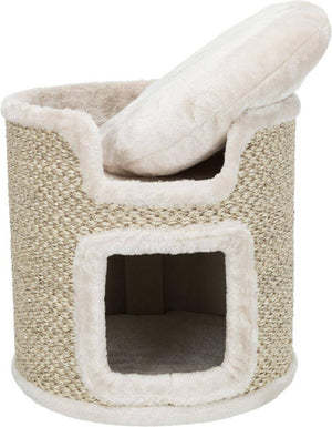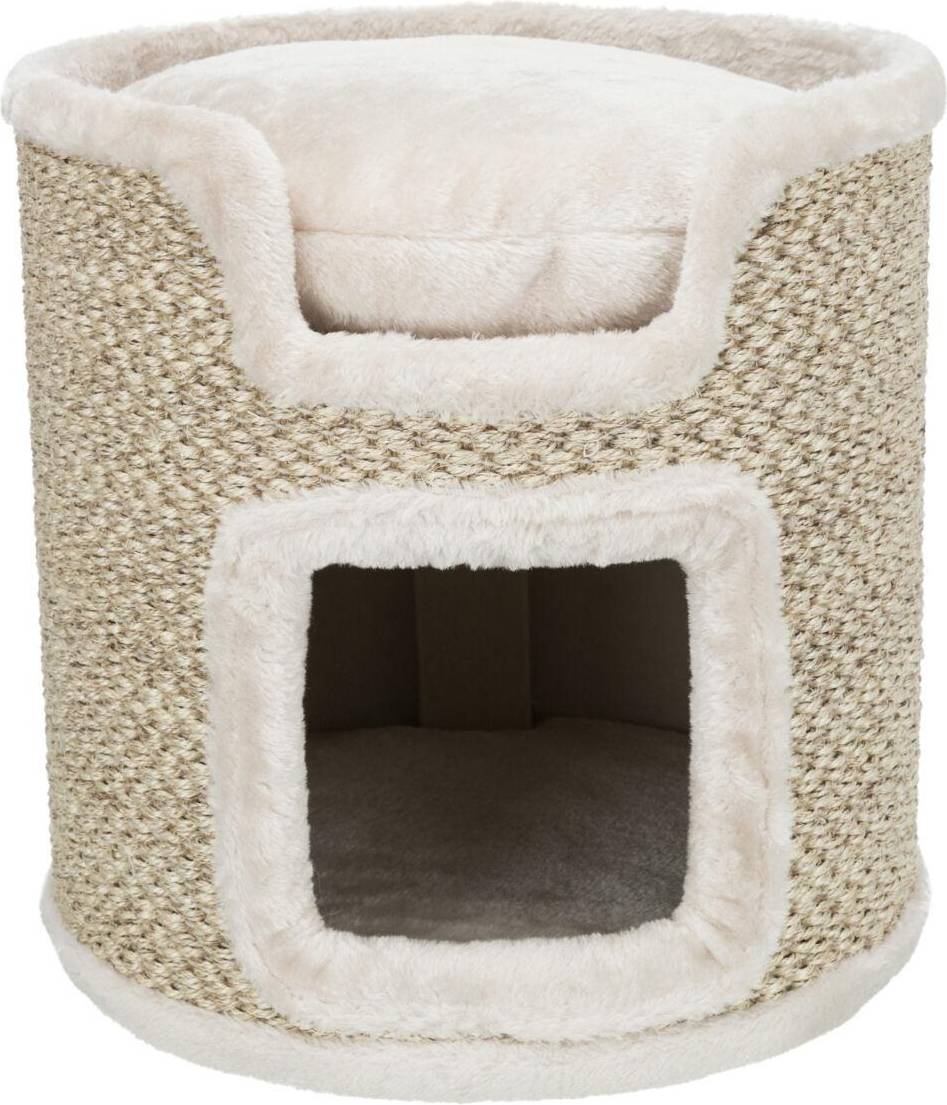 De Trixie Krabton Ria Krabpaal Lichtgrijs/Natuur van 37X37X37 cm is een ronde krabton voor de kat met sisal krabvlakken, schuilplaats, kussen en gevoerde ligplateaus. Een heerlijke eigen plek voor jouw kat hoeft niet te veel ruimte in te nemen, dat bewijst deze leuke krabton van Trixie. Krabton Ria is een compacte krabpaal voor de kat met twee verdiepingen. De ligplateaus zijn gevoerd voor meer comfort en het bijgeleverde wendbare kussen zorgt ervoor dat jouw kat heerlijk zacht kan wegdromen. De schuilplaats onderop is bekleed met lekker zacht pluche en fleece en aan de buitenkant is de ton bekleed met sisal, om jouw kat genoeg krabmogelijkheden te bieden. Krabben is een natuurlijke behoefte voor de kat, dus zorgt altijd voor voldoende mogelijkheden om te voorkomen dat jouw kat aan het meubilair begint!