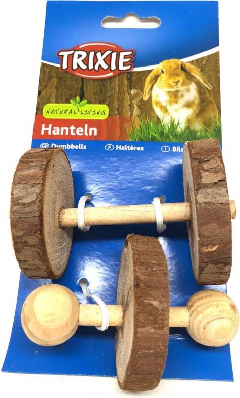 Deze set met twee verschillende dumbells is bedoeld als knaag- en speelgoed voor middelgrote knaagdieren als konijnen en cavias. Met deze halters van natuurlijk hout, kan jouw knaagdier zich helemaal uitleven.