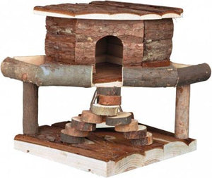 Het Trixie Natural Living Huis Ida 19 x 19 x 20 cm is een leuk speelhuis voor hamsters, muizen en andere kleine knaagdieren, met schommel en trap gemaakt van schorshout. Een origineel huisje waarin jouw dier zich graag zal terugtrekken! Dit leuke huisje staat op een plateau, met daaronder een leuke schommel. Het trapje naar het huisje bestaat uit schijfjes hout. Het hout is vrij van hars en gemaakt zonder giftige lijm, en daardoor ook aan te knagen.