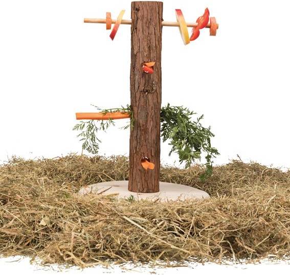 De Trixie Natural Living Voerboom is een leuke, natuuriljke speelboom voor konijnen en knaagdieren die gevuld kan worden met voer en lekkernijen. Ideaal om jouw dier mentale uitdaging te brengen en verveling tegen te gaan! Je kunt de gaatjes in de boom gebruiken om er bijvoorbeeld peentjes en wilgentakjes in te verstoppen en aan de uitstekende takjes te hangen. Ook voorkom je op die manier gelijk verontreiniging van het voer door ontlasting en urine omdat het niet meer op de bodem van de kooi hoeft te liggen. Door het leuke, natuurlijke uiterlijke van de voerboom wordt de kooi bovendien ook nog eens leuk aangekleed!