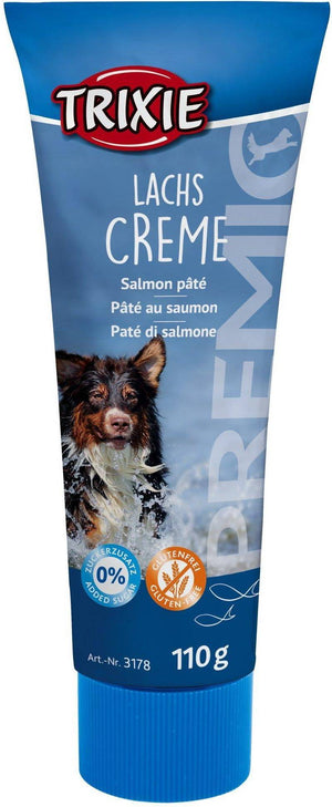 De Trixie Premio Zalmpasta in 110 gram iis aanvullend voer voor honden in een smakelijke pasta in tube met lamsmaak, een handige beloning voor de hond! Deze pasta kan direct uit de tube gegeven worden en heeft daardoor een groot beloningseffect. Ook maakt deze beloning het geven van medicijnen makkelijker. De smakelijke pasta is glutenvrij en gemaakt zonder toegevoegde suiker. Ideaal als beloning tijdens het trainen, die zeer populair zal zijn bij jouw hond!