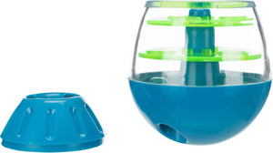 Het Trixie Roly Poly Snack Tuimel Ei Grijs/Lime Groen 13 cm is een intelligentiespel gebaseerd op beloning voor de hond. Dit leuke voerspel heeft de vorm van een ei en is voorzien van vier uitneembare schuifjes met openingen, waardoor de beloningen naar het gat naar buiten onderaan het ei vallen. De diverse combinaties van de schijfjes zorgen voor verschillende moeilijkheidsgraden van het spel. Door het tuimeleffect vallen er vervolgens aan de onderkant beloningssnoepjes uit het ei wanneer de hond er tegenaan duwt en er mee beweegt. Om het voor de baas gemakkelijk te maken het ei te vullen, is de bovenkant afschroefbaar. Het ei komt met een handige handleiding met tips en handigheidjes voor een optimale training.