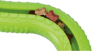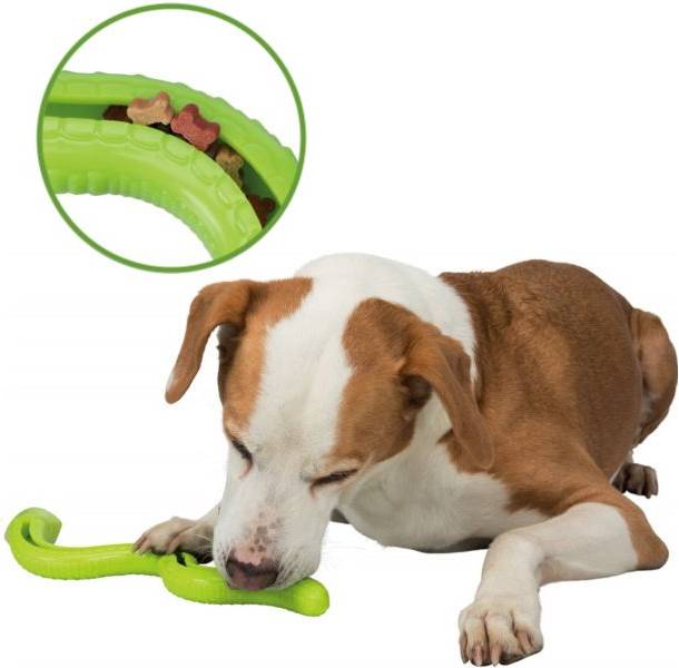 De Trixie TPR Snackslang Groen 42 cm hondenspeelgoed is een hondenspeeltje van TPR die gevuld kan worden met snacks. Wil je jouw hond bezighouden als je er niet bent, of op een leuke manier belonen? Deze vrolijke snack-slang van Trixie biedt daar de perfecte manier voor! De slang is gemaakt van thermoplastisch rubber en is open aan de onderzijde. In deze spleetvormige opening kun je verschillende soorten voer of snacks stoppen, zodat de hond spelenderwijs bezig is zijn beloning te krijgen. Door de smalle opening is de slang ook geschikt voor bijvoorbeeld leverworst.