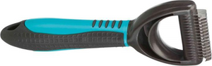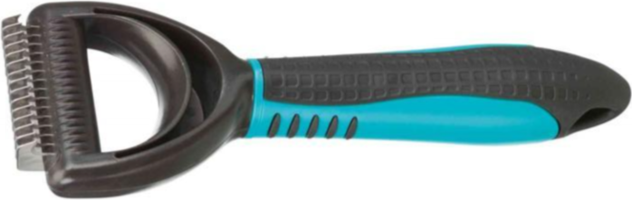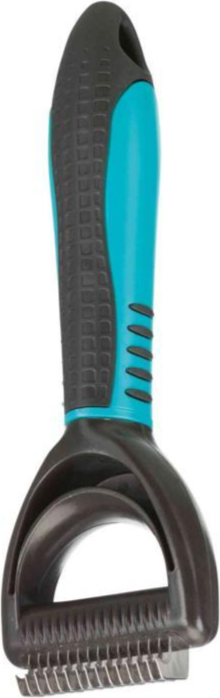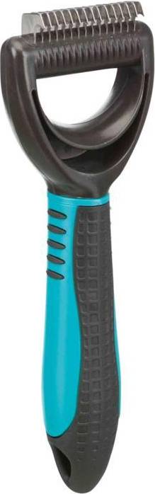 De kam is voorzien van een vertanding met een lengte van 1 cm, ideaal voor het gladmaken van zowel het dekhaar als de vervilte onderwol. De combinatie van het kunststof handvat met een rubberen coating en het metalen kamgedeelte zorgt voor een stevige grip en een lange levensduur.