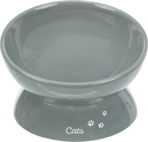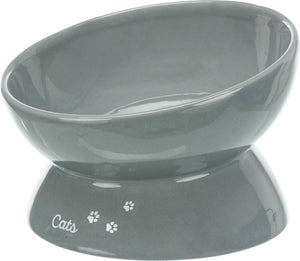 Trixie Voerbak Kat XXL Keramiek Verhoogd Grijs 350 ml / 17 cm is een extra grote, verhoogde kattenbak met ergonomische vorm. Deze leuke bak is van gelakt keramiek en daardoor geschikt voor droogvoer, natvoer en water. De bak staat niet direct op de grond, maar is wat verhoogd, zodat de kat niet door zijn voorpoten hoeft te zakken of teveel hoeft te bukken, wat de spijsvertering ten goede komt. De rand is aan de voorkant wat lager zodat de kat comfortabel kan eten. Deze ergonomische bak is uitgevoerd in grijs met de opdruk 'cats' en pootafdrukjes in het wit aan de voorkant.