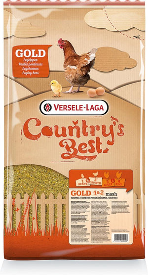 . GOLD 1&2 mash is een volledig start- en opfokvoeder voor legkippen, geschikt vanaf de eerste dag tot het eerste ei.