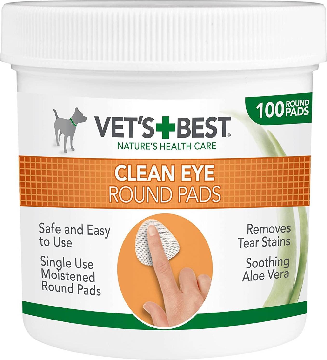 Vets Best Clrean Eye Round Pads 100 stuks zijn handige reinigsingsdoekjes om de traansporen bij de ogen van de hond te verwijderen. Traanvlekken komen vaak voor bij honden met een witte vacht. Regelmatig gebruik van deze reinigingpads zal helpen om de verkleurde gedeeltes rondom het oog te verminderen. Haal simpelweg een pad uit de verpakking en gebruik deze om de vacht rondom de ogen te reinigen. Geen extra middelen nodig!