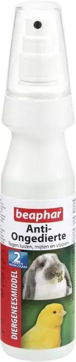 Beaphar huidspray, oplossing voor konijnen, knaagdieren, fretten, kooi- en volièrevogels en duiven ter bestrijding van ongedierte (luizen, mijten en vlooien). Deze spray is weken werkzaam.