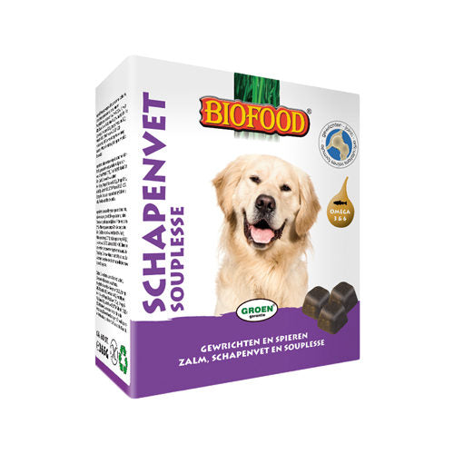 Samenstelling: Schapenvet (96%), souplesse (4% waarvan: glucosamine (groenlipmossel) 4000mg/kg, chondroïtine (viskraakbeen) 3000mg/kg)
