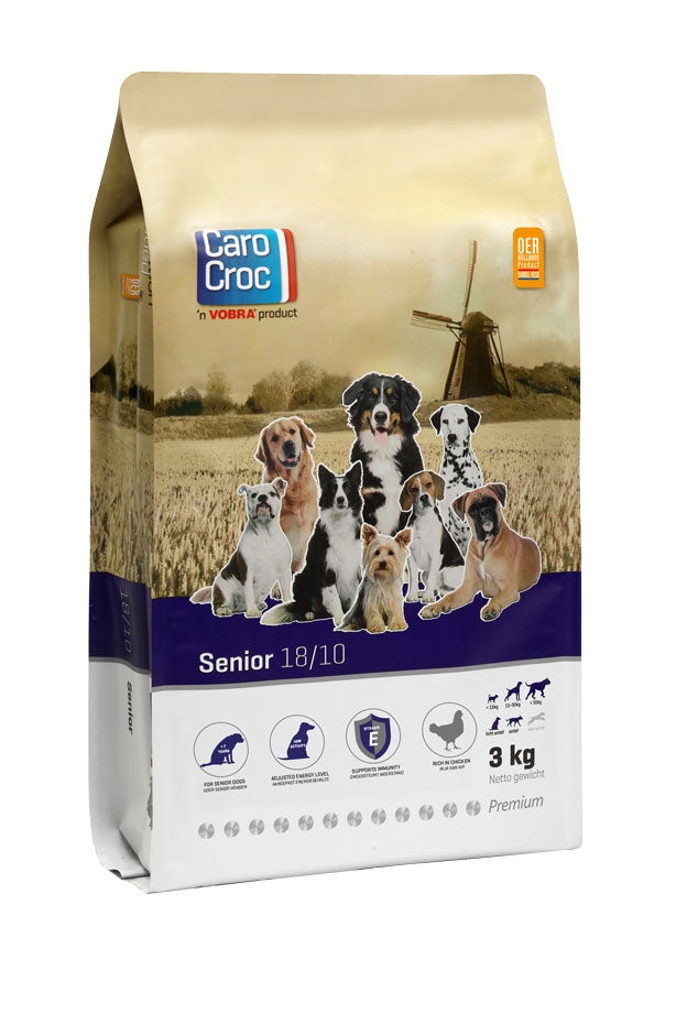 Complete geëxpandeerde zeer licht verteerbare brokken voor oudere honden van alle rassen. In deze smakelijke en licht verteerbare voeding is rekening gehouden met de lagere eiwit en mineralen behoefte van oudere honden. Dit is nodig om de stofwisselings- en verteringsorganen goed te laten functioneren en de nieren niet te overbelasten. Bevat extra Omega 3 en 6. Carocroc Senior is bovendien zeer geschikt voor honden met spijsverterings- en nierstoornissen.