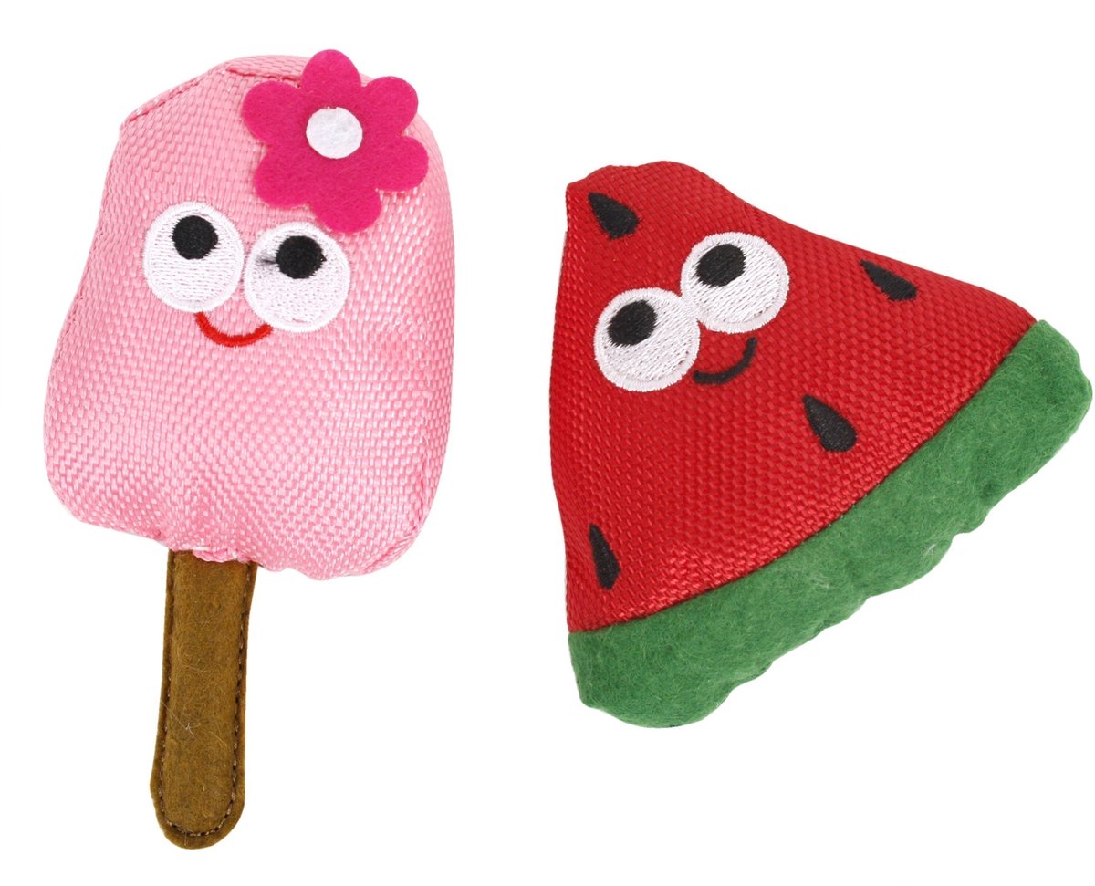 De Fofos Summer Watermeloen Met Ijsje 12 cm is zomers kattenspeelgoed met kattenkruid. Dit setje bestaat uit twee kattenspeeltjes, een watermeloenpunt en een ijsje, met vrolijke gezichtjes. Het ijsje is voorzien van een stokje en bloemetje dat jouw kat zeer interessant zal vinden en beide speeltjes zijn gevuld met kattenkruid, voor meer aantrekkelijkheid. Van een stevige stof, waar jouw kat heerlijk mee kan spelen, gooien en op kan bijten.