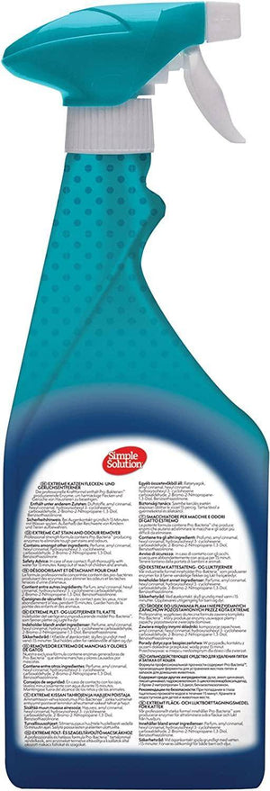 Simple Solution Stain & Odour Vlekverwijderaar Kat Extreme 750 ml is een sterke vlekkenverwijderaar en geurverwijderaar in spray vorm. Sommige katten markeren hun territorium in huis of hebben wel eens een ongelukje, wat zorgt voor vervelende vlekken en geurtjes. Met de Stain & Odour Vlekverwijderaar van Simple Solution worden de gemarkeerde plekken grondig schoongemaakt. Ook helpt deze spray het herhalen van markeren tegen te gaan.