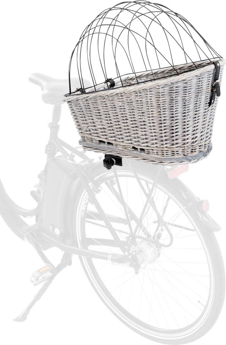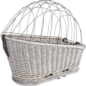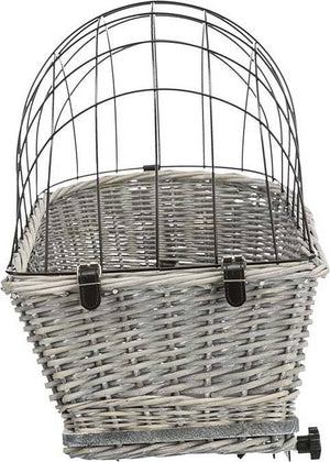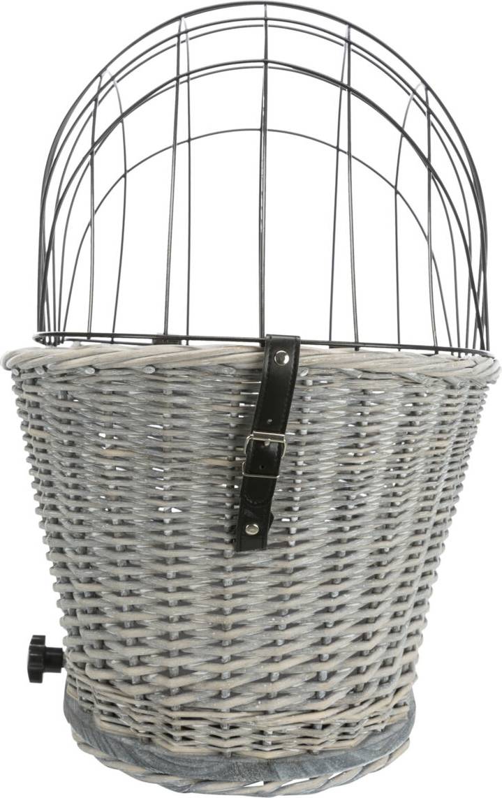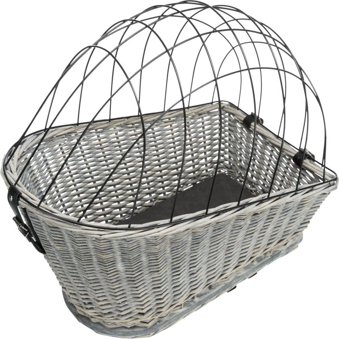 Met de Trixie Fietsmand Bagagedrager Met Rooster Grijs 55X35X49 cm gaat jouw hond comfortabel en veilig met jou mee op al jouw fietstochten. Deze leuke rieten mand is gemaakt van gevlochten wilgentenen in een frisse, zomerse lichtgrijze kleur. De mand is voorzien van een rooster om te voorkomen dat de hond onderweg uit de mand kan springen. De mand kan op bagagedragers met een breedte van 10,5 - 14,5 cm bevestigd worden, zodat je jouw stuur vrij houdt om comfortabel te sturen. Het bijgeleverde kussen met velours-overtrek zorgt voor een comfortabele rit voor jouw dier.