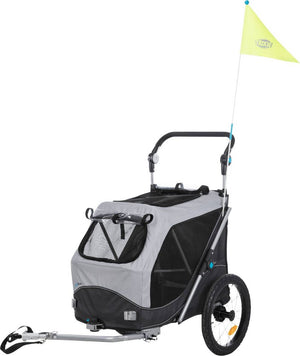 De fietskar is makkelijk in te klappen en compact op te bergen en komt met koppeling. En nog beter? Je kunt de fietskar heel gemakkelijk ombouwen tot een buggy met het los verkrijgbare voorwiel!