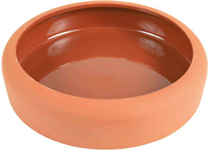 De Trixie Keramische Voerbak / Drinkbak Afgerond met een doorsnede van 19 cm is een vaatwasserbestendige bak met een gebogen rand tegen morsen. Ideaal voor dieren die wat slordig eten of drinken! Deze fijne voerbak heeft een hoge, naar binnen gebogen rand: dit zorgt ervoor dat dieren die schuiven met hun voer en spetteren met water de inhoud van de bak niet door de gehele kooi verspreiden. De bak is uitgevoerd in terracotta-look keramiek met een matte buitenkant en een gelakte binnenzijde. Hierdoor is het makkelijk om de bak te ontdoen van voerresten en vuil. De bak is geschikt voor in de vaatwasser.