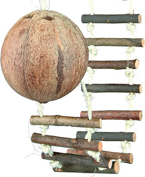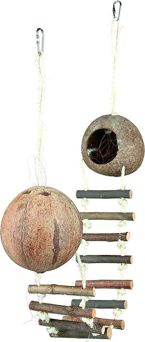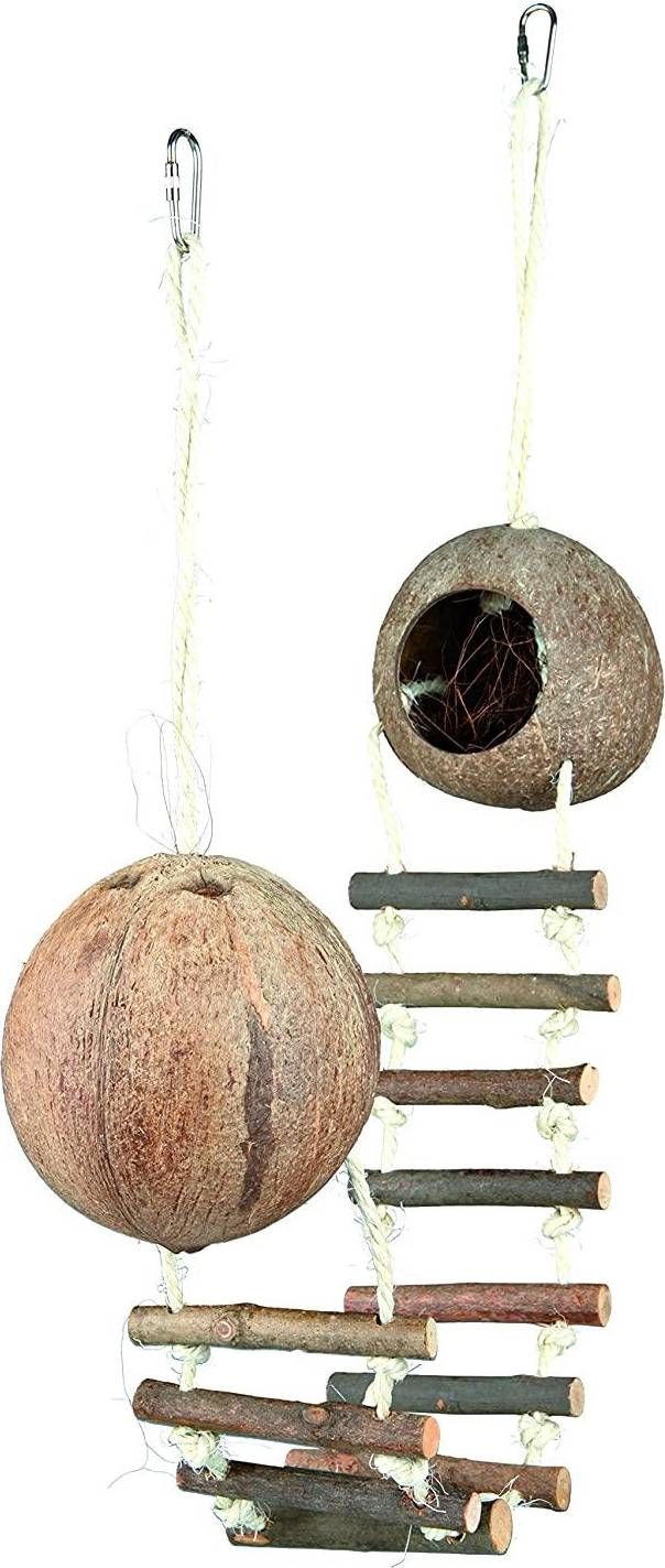 Het Trixie Kokosnoothuis Met Kokosvezels van 13 x 56 cm is een leuk speelhuis voor hamsters, muizen en gerbils van natuurlijke materialen. Het leuke huis is gemaakt van een uitgeholde kokosnoot, met daarin losse kokosvezels die gebruikt kunnen worden als nestmateriaal. Muizen en hamsters zijn hier graag mee bezig! Het kokosnoot-huisje is voorzien van een touw met een haak, zodat je hem op de gewenste plek in de kooi kunt hangen. Het huisje is voorzien van een trap van houten takjes zodat hij ook bereikbaar blijft als je hem water hoger ophangt. Tevens is het mogelijk twee trappen met elkaar te verbinden, waardoor je één grote trap tussen twee kokosnoten krijgt. Leuk, natuurlijk speelgoed voor jouw kleine knager!