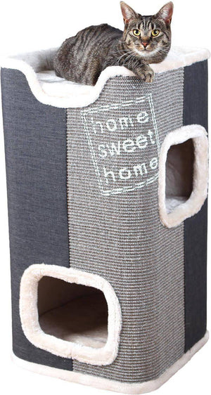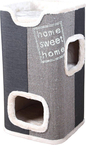 De Trixie Krabton Jorge Antraciet/Grijs/Lichtgrijs 38X38X78 cm is een krabpaal van gewoven stof en pluche met sisal krabvlakken. In de paal zijn twee verdiepingen, elk met een wendbaar kussen. De hoezen van de kussens zijn te wassen in de wasmachine op 30 graden Celsius, de binnenvoering is geschikt voor handwas. De schuilplaatsen zijn geheel voorzien van pluche en de paal is voorzien van een sisal-krabvlak.