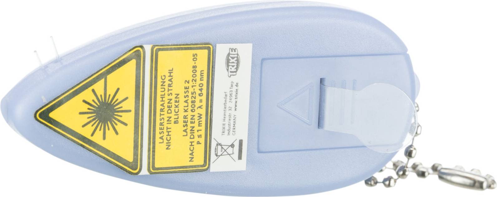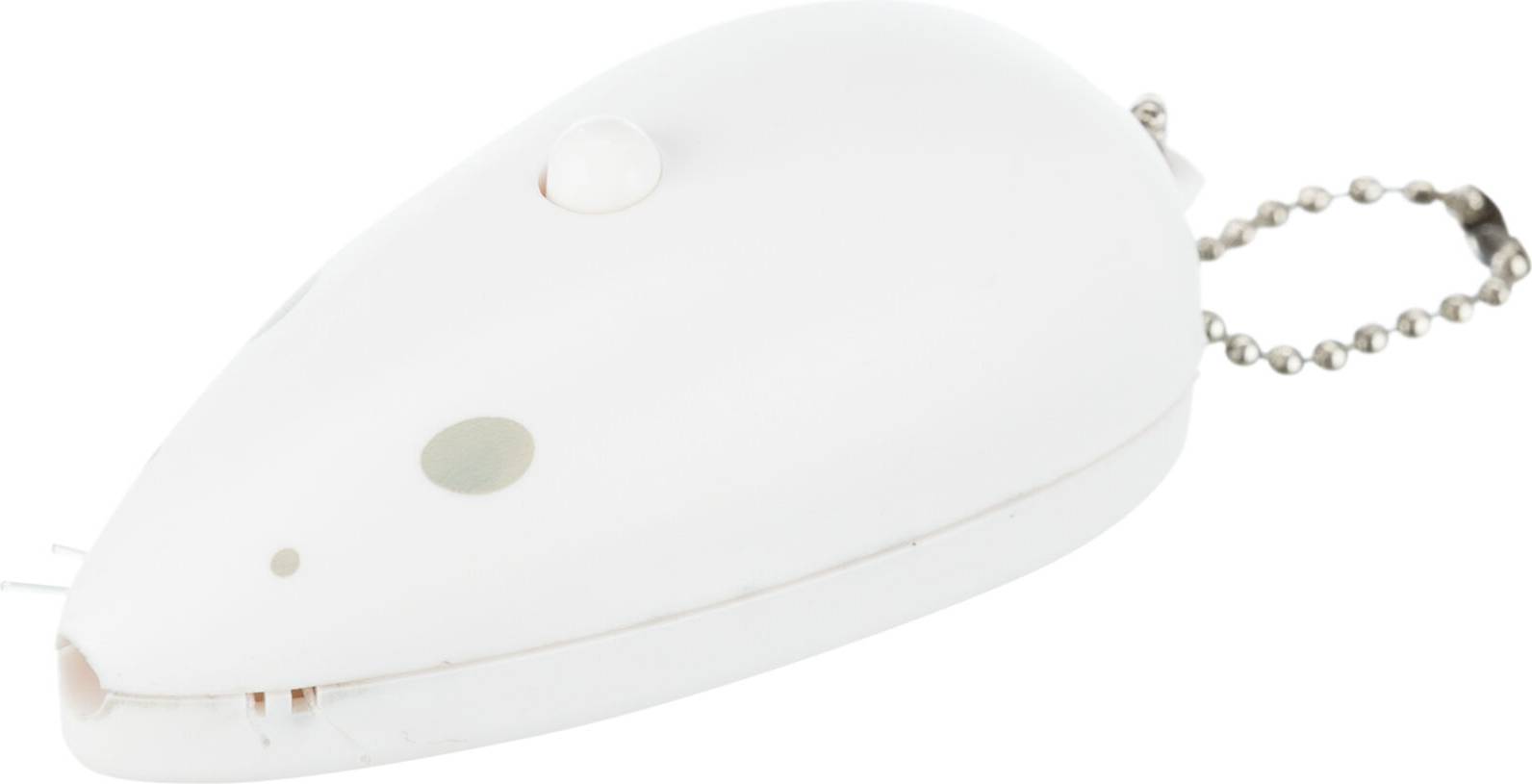 De laserstraal zet je aan en uit door het knopje op de rug van de muis in te drukken. En aan het kettinkje achterop de muis kun je hem veilig weghangen zodat jouw kat niet de hele dag achter een laserpuntje aangaat!