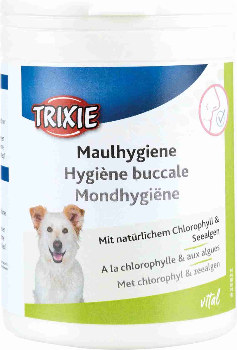 De Trixie Mondhygiëne Tabletten 220 gr bevatten munt, peterselie, algen en chloryfyl die tandsteen helpen voorkomen en zorgen voor een frisse adem. Ideaal voor honden die last hebben van een slechte adem of problemen met tandsteen! Chlorofyl werkt effectief bij een slechte adem en munt en peterselie zorgen voor een heerlijke verfrissing. De algen in deze tabletten helpen tandsteen voorkomen. De tabletten zijn geschikt voor langdurig gebruik: geeft de hond 8 tabletten per 10 kg lichaamsgewicht per dag.