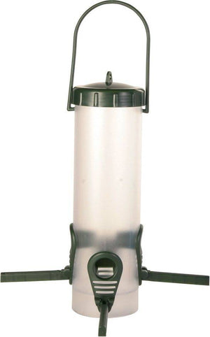De voedersilo is voorzien van vier zitstokken waarop de vogels kunnen zitten om rustig te eten. Voor elke zitstok zit een uitsparing waaruit de vogels het voer kunnen oppikken.